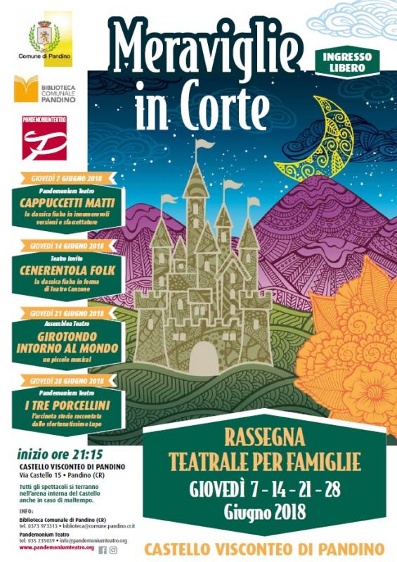 Ha preso il via il giovedì 7 giugno “MERAVIGLIE IN CORTE”, la rassegna estiva di teatro per le famiglie organizzata da Pandemonium Teatro di Bergamo in collaborazione con il Comune di Pandino e la Biblioteca Comunale: 4 appuntamenti nelle serate dei giovedì di giugno, all’insegna della bellezza del teatro e della magia di un luogo evocativo e affascinante. Sarà infatti il Castello Visconteo di Pandino a fare da cornice alle storie raccontate, ospitando il pubblico di tutte le età nelle fresche sere estive.