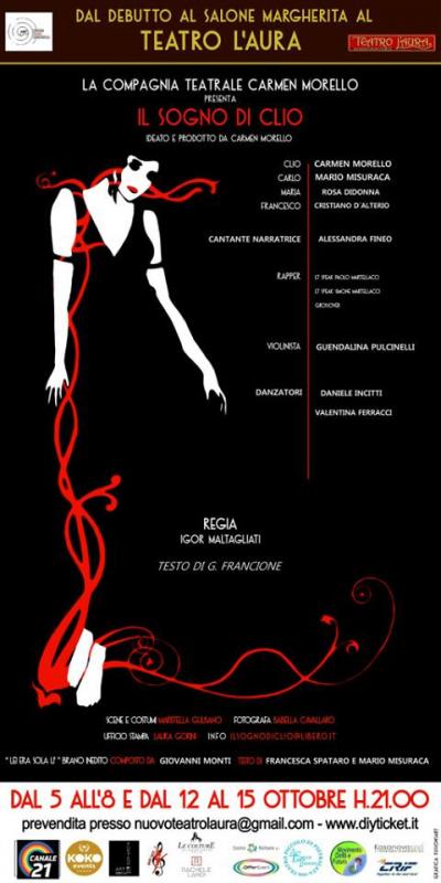 Il Teatro L’Aura è lieta di presentare il primo spettacolo della stagione, IL SOGNO DI CLIO dal 5 al 15 ottobre 2017 spettacolo ideato e prodotto da Carmen Morello su testo di Gennaro Francione, per la regia di Igor Maltagliati e con Carmen Morello, Mario Misuraca, Rosa Didonna e Cristiano D’Alterio.