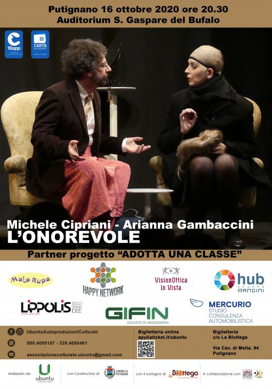 Venerdì 16 ottobre - Auditorium San Gaspare del Bufalo - Putignano – Ba Michele Cipriani e Arianna Gambaccini inaugurano la stagione teatrale 2020/21 con lo spettacolo “L’Onorevole”
