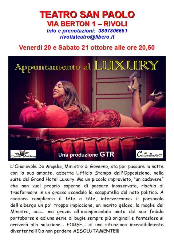 L'Onorevole De Angelis, Ministro di Governo, sta per passare la notte con la sua amante, addetta Ufficio Stampa dell'Opposizione, nella suite del Grand Hotel Luxury. Ma un piccolo imprevisto, “un cadavere” che non vuol proprio saperne di passare inosservato, rischia di trasformare in un grosso scandalo la scappatella del noto politico. A rendere complicato il téte a téte, interverranno: il personale dell'albergo un po' troppo impiccione, un marito geloso, la moglie del Ministro, ecc... ma grazie all'indispensabile aiuto del suo fedele portaborse e ad una serie di bugie sempre più originali e fantasiose si arriverà alla soluzione... FORSE... di una situazione incredibilmente divertente!!! Da non perdere ASSOLUTAMENTE!!!