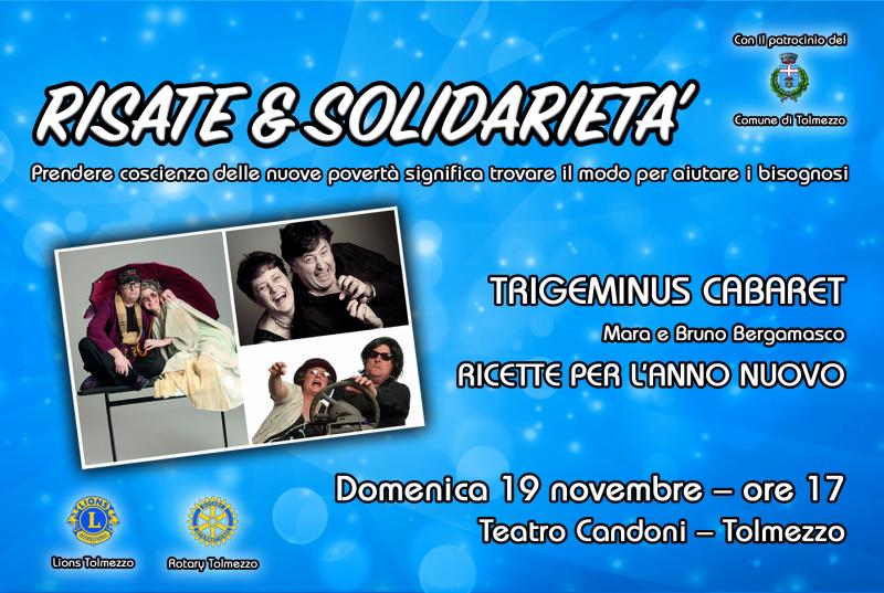 L’appuntamento solidale è domenica 19 novembre alle ore 17 al Teatro Candoni di Tolmezzo, dove andrà in scena uno spettacolo di cabaret esilarante del mitico duo Trigeminus, i comici Mara e Bruno Bergamasco. La fortunata pièce, per la prima volta in Carnia, s’intitola “Ricette per l’anno nuovo”, ed è appunto un ricettacolo comico, pieno di buoni consigli e buone pratiche per un anno nuovo migliore, dove diversi personaggi nei più improbabili contesti, si trovano a ragionare insieme per progettare il futuro.