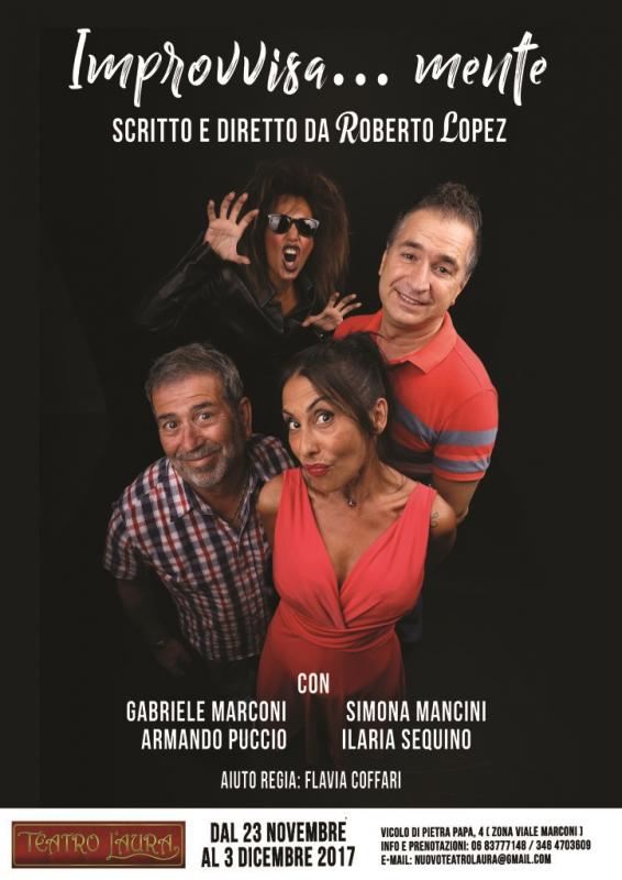 Torna al Teatro L'Aura un testo scritto e diretto da Roberto Lopez e con lui anche l'ironia di Gabriele Marconi. Dal 23 novembre al 3 dicembre è in scena Improvvisa...mente. Sul palco oltre a Marconi anche Simona Mancini, Armando Puccio e Ilaria Sequino.