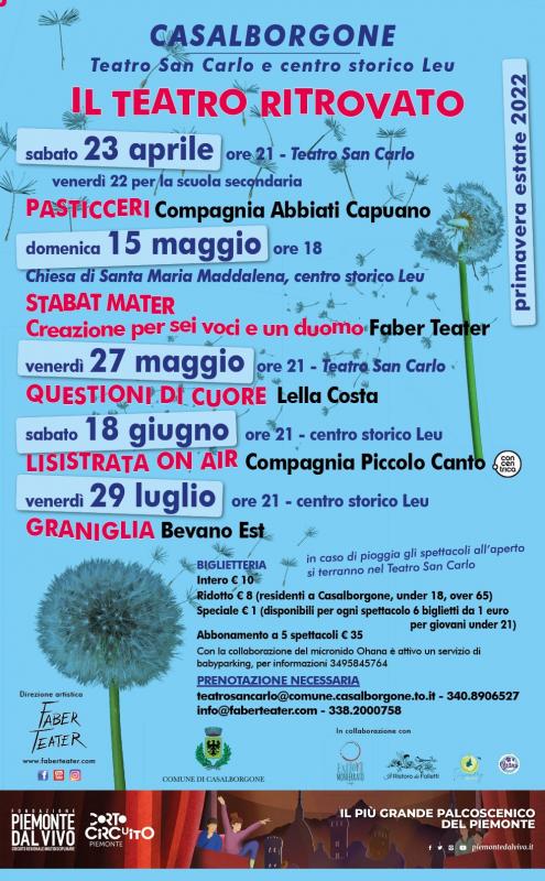 Raggiunge le cinque edizioni la rassegna Il teatro ritrovato di Casalborgone (To) organizzata dal Comune di Casalborgone e Piemonte dal vivo con la direzione artistica di Faber Teater e si prepara ad accogliere il suo pubblico aprendo la campagna abbonamenti per i 5 appuntamenti che compongono la rassegna, diffusi tra il Teatro San Carlo, il centro storico Leu e la chiesa di Santa Maria Maddalena.