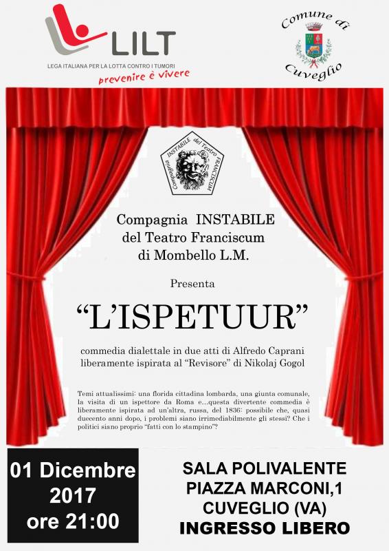 Lo spettacolo teatrale è della famosa Compagnia INSTABILE del Teatro Franciscum di Monbello L.M, la commedia brillante in due atti ha come titolo "L'ISPETUUR" e sarà messa in scena venerdi 1 Dicembre ore 21.00 nella nostra sala Polivalente di Cuveglio Piazza Marconi, 1
