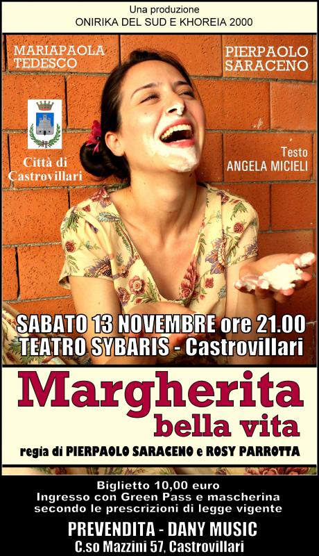 Con la riapertura totale dell’attività del settore dello spettacolo dal vivo, si apre il sipario del Teatro Sybaris di Castrovillari, con lo spettacolo Margherita bella vita, prodotto da Khoreia 2000 e Onirika del Sud, in scena sabato 13 novembre alle ore 21.00, con il patrocinio dell’Amministrazione comunale della città del Pollino. Dopo il successo dell’opera Viole’, spettacolo teatrale prima, romanzo poi e infine cortometraggio, Khoreia 2000 decide di continuare il suo impegno nell’affrontare tematiche sociali, troppo spesso taciute, confrontandosi, questa volta, con uno dei mali del secolo, la depressione. E Margherita bella vita ne mostra il delicato tema in tutta la sua interezza, per dare luce al buio e voce al silenzio. <>.