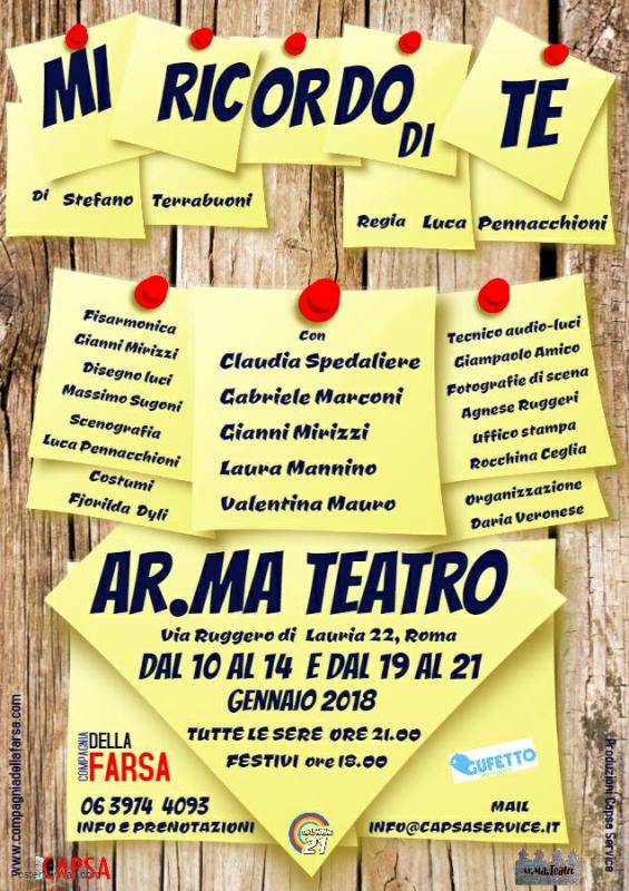 Mi ricordo di te, è con questo spettacolo che Daria Veronese direttrice dell' Ar.Ma Teatro inaugura il 2018. In scena, dal 12 al 21 gennaio, solo dal venerdì alla domenica, la Compagnia della Farsa e Capsa Service producono il testo di Stefano Terrabuoni diretto da Luca Pennacchioni con Claudia Spedaliere, Gabriele Marconi, Gianni Mirizzi, Laura Mannino,Valentina Mauro e il M° Gianni Mirizzi alla fisarmonica.