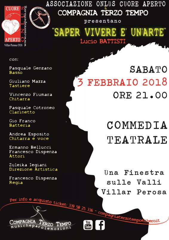 Sabato 3 febbraio la compagnia teatrale “Terzo Tempo” di Torino, proporrà presso una “Finestra sulle Valli” di Villar Perosa alle ore 21 uno spettacolo dal titolo “Saper vivere è un’arte”, spettacolo dedicato al cantautore Lucio Battisti ricreandone il viaggio della sua vita. Assieme a Mina ha rivoluzionato la scena della musica leggera italiana , però ad un certo punto della sua carriera, ha lasciato un vuoto incolmabile nei cuori degli italiani a seguito del suo ritiro dalle scene. L’impianto scenico dello spettacolo si sarebbe potuto costruire sull’ennesima storia romanzata a descrizione dei motivi che hanno portato il cantautore a fuggire, ma lo spettacolo rimane sull’onda della verità e di ciò che tutti sanno e tutti ricordano di questo grande artista; l’eco delle parole alimenta l’eco delle note e insieme per manifestarsi in prosa e musica in un concerto all’unisono. La compagnia “Terzo Tempo”, nasce nel 2013 ed è composta da professionisti del mondo dello spettacolo rispettivamente da attori, regista, musicisti e tecnici. L’incipit iniziale nasce dall’esigenza di proporre allo spettatore una forma di spettacolo eterogenea e poco statica introducendo nella realizzazione dello stesso le forme artistiche della musica e della recitazione. L’esperienza di ogni componente e la grande passione che accomuna tutti al mondo dell’arte ha concesso alla compagnia di lavorare su temi e su spettacoli totalmente inediti e scritti di proprio pugno sia nella forma letteraria che nella forma musicale.