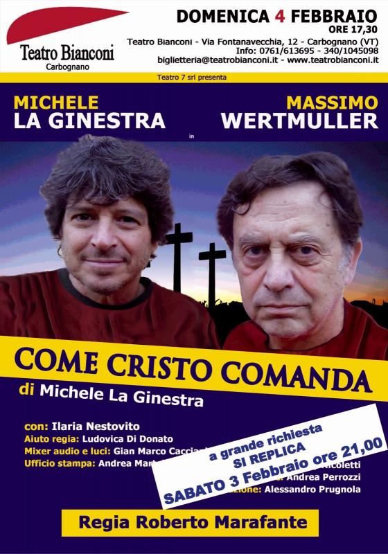 Quando fu svelato il cartellone di questa stagione del Teatro Bianconi era subito stato chiaro che l’appuntamento di maggiore rilievo sarebbe stato indubbiamente la Prima Nazionale di “Come Cristo comanda” di Michele La Ginestra, con la partecipazione di due straordinari attori come lo stesso Michele La Ginestra e Massimo Wertmuller insieme ad Ilaria Nestovito e con la regia di Roberto Marafante. Ma quello che neanche la Direzione artistica del Bianconi nel suo più azzardato ottimismo poteva prevedere è stato lo straordinario successo e richiamo che tale spettacolo ha avuto ancor prima della sua messa in scena. L’attesa e la richiesta del pubblico è stata sin da subito enorme e senza nemmeno alcun battage pubblicitario i posti dell’unico appuntamento, inizialmente previsto per Domenica 4 febbraio 2018 alle ore 17.30, sono andati letteralmente a ruba poche ore dopo la messa in vendita e già dalla settimana scorsa sono esauriti. Per la prima volta il Bianconi ha registrato il sold out già due settimane prima dell’evento con decine di richieste inevase che hanno convinto la Direzione artistica e la produzione dello spettacolo a programmare una replica straordinaria a grandissima richiesta per sabato 3 febbraio 2018 alle ore 21.00 ed è facilmente prevedibile che anche questo nuovo appuntamento registrerà presto il tutto esaurito per cui si esorta il pubblico interessato a prenotare al più presto gli ultimi posti disponibili