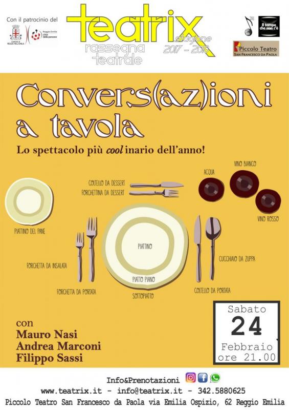 Qual è il segreto di un buon brodo? Come si ottiene una sfoglia perfetta? E qual è il modo migliore di piegare i cappelletti? Nella cucina, cuore del focolare, due amici, cuochi per passione, si scambiano opinioni e ricette. Gli animi si scaldano, la pentola ribolle e tra letture e dialoghi, accompagnati dalle note di un caldo sassofono, si cucina per davvero. E dopo tanto parlare non può mancare l'assaggio. Uno spettacolo che è anche degustazione, una coccola per le orecchie ed il palato. Allacciate il tovagliolo: è pronto in tavola!