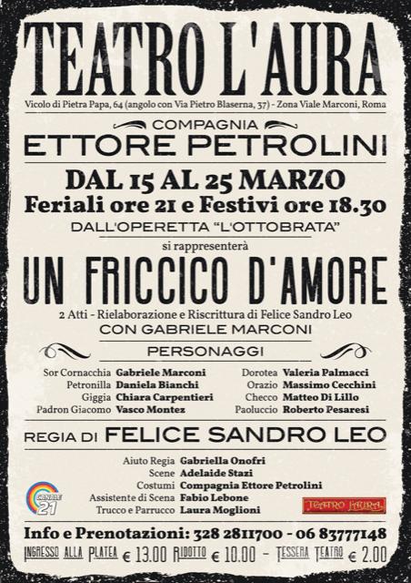 Grande attesa al Teatro L’Aura per il debutto della "Compagnia Ettore Petrolini" diretta da Felice Sandro Leo con UN FRICCICO D’AMORE, una rivisitazione dell’operetta "L’Ottobrata" di Ettore Petrolini in scena con Gabriele Marconi, Daniela Bianchi, Chiara Carpentieri, Vasco Montez, Valeria Palmacci, Massimo Cecchini, Matteo Di Lillo e Roberto Pesaresi