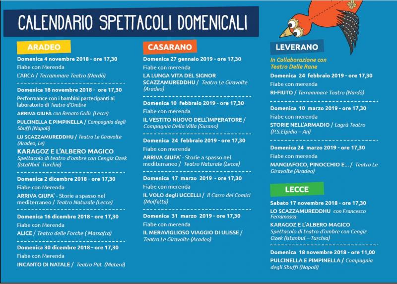 Domenica 24 febbraio (ore 17.30 - ingresso 5 euro) la rassegna propone un doppio appuntamento. A Casarano sul palco Arriva Giufà - Storie a spasso nel Mediterraneo di Teatro Naturale con Renato Grilli, le musiche originali del fisarmonicista e compositore Rocco Nigro, scene e immagini a cura del Teatro Le Giravolte. Le storielle popolari tradizionali di Giufà, il più noto personaggio delle narrazioni orali mediterranee, servono a insegnare, divertire e alla fine per “fare la pace”. In mezzo a tante storie tristi che ci tocca raccontare, almeno finiamo con qualche storiella allegra! Perché ogni storiella che fa ridere insieme "mette pace" nel cuore di chi ascolta. L'ironia e l'autoironia sono un forte antidoto al conflitto: finché ci si prende in giro, anche se siamo diversi, non si trascende, non si passa mai alle mani. Se ridiamo insieme, ogni contrasto mostra la sua parte buffa, a volte comica. E questo può servirci a superare pregiudizi, a farci immuni dai fanatismi. Nel Teatro Comunale di Leverano, in collaborazione con il Teatro delle Rane, la compagnia Terrammare Teatro proporrà "Ai margini del bosco", da Hansel e Gretel, una delle più belle fiabe dei fratelli Grimm, con scritto e diritto da Silvia Civilla con Chiara De Pascalis e Marta Vedruccio e le musiche dal vivo di Rocco Nigro. Olaip è un uccellino che ha paura di volare e che rimane a terra quando il suo stormo intraprende il lungo viaggio stagionale verso le terre più lontane. La fortuna vuole che incontri nel bosco un dotto e affettuoso gufo, il signor Gù, che lo condurrà alla ricerca di sè stesso e al superamento delle paure che gli impediscono di spiccare il volo. Il saggio amico di Olaip lo porterà con sè nel più folto del bosco, e gli farà spiare tra le pieghe della storia di Hànsel Gretel e della loro terribile avventura con la matrigna cattiva e la strega che vuole mangiarli per cena. Gù dimostra ad Olaip come grazie alla forza di volontà. al coraggio ed all'ingegno non vi siano, al mondo, ostacoli che non possano essere superati.