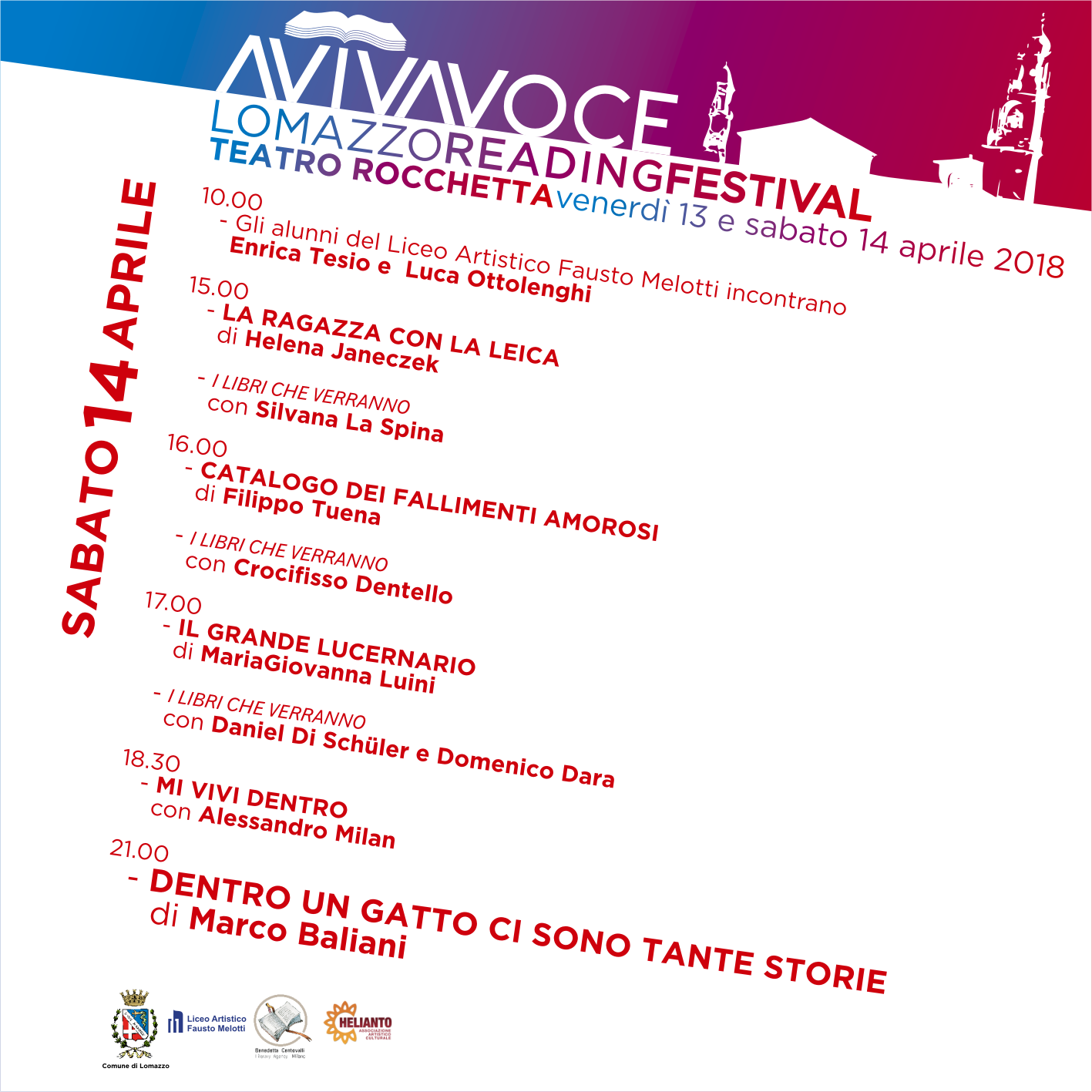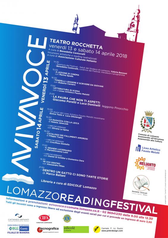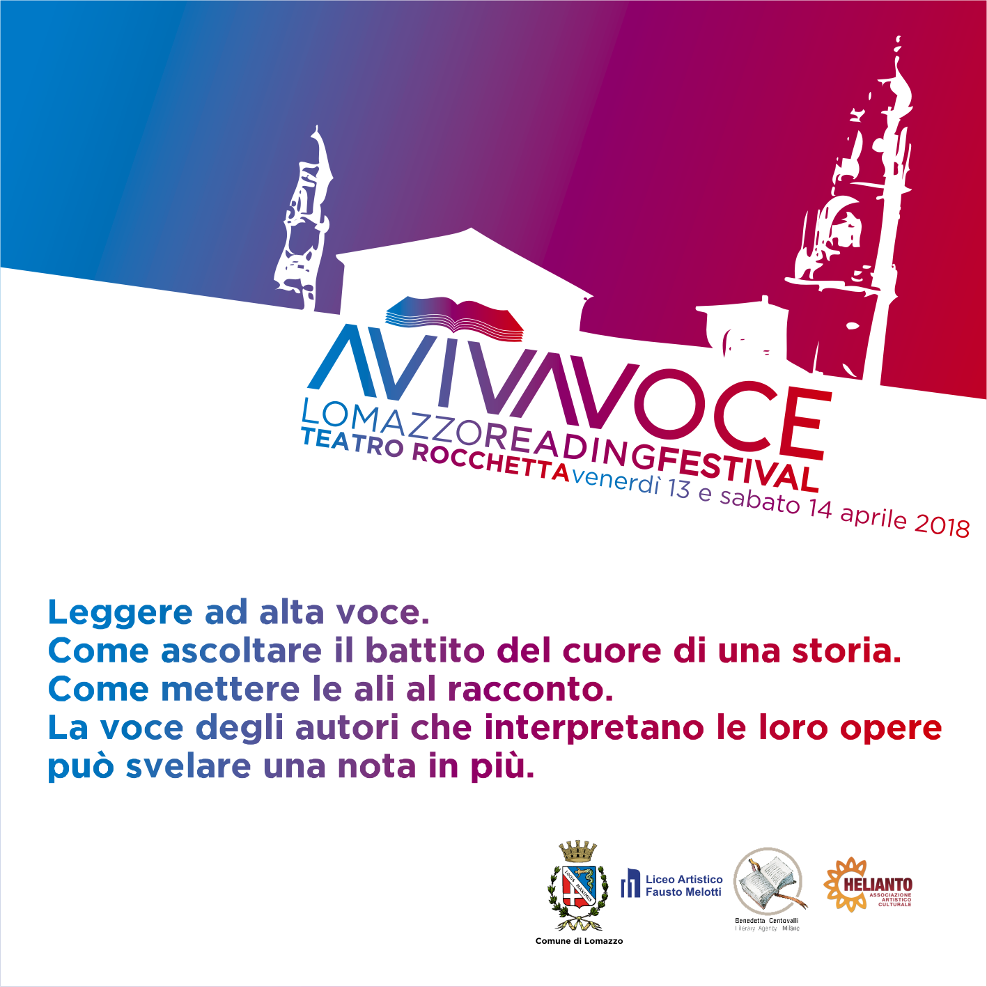 Saranno infatti gli scrittori a leggere i loro testi ad alta voce.A VIVA VOCE - Festival del ReadingTeatro Rocchetta – Lomazzo Ingresso liberoA cura di Benedetta Centovalli. Una iniziativa promossa dal Comune di Lomazzo (Assessorato all’Istruzione, Assessorato alla Cultura)Incursioni artistiche e reading teatralizzati a cura di Associazione Culturale Helianto. In collaborazione con il Liceo Artistico Fausto Melotti Festival del Reading