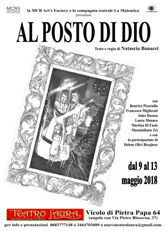 Dal 9 al 13 maggio 2018 debutta al teatro L’Aura AL POSTO DI DIO regia di Natascia Bonacci in collaborazione con gli artisti della compagnia teatrale “La Maieutica” con Beatrice Picariello, Francesco Migliorati, Joules Dossou, Laura Monaco, Martina Di Fazio, Massimiliano Zei e con la partecipazione di Helene Olivi Borghese.