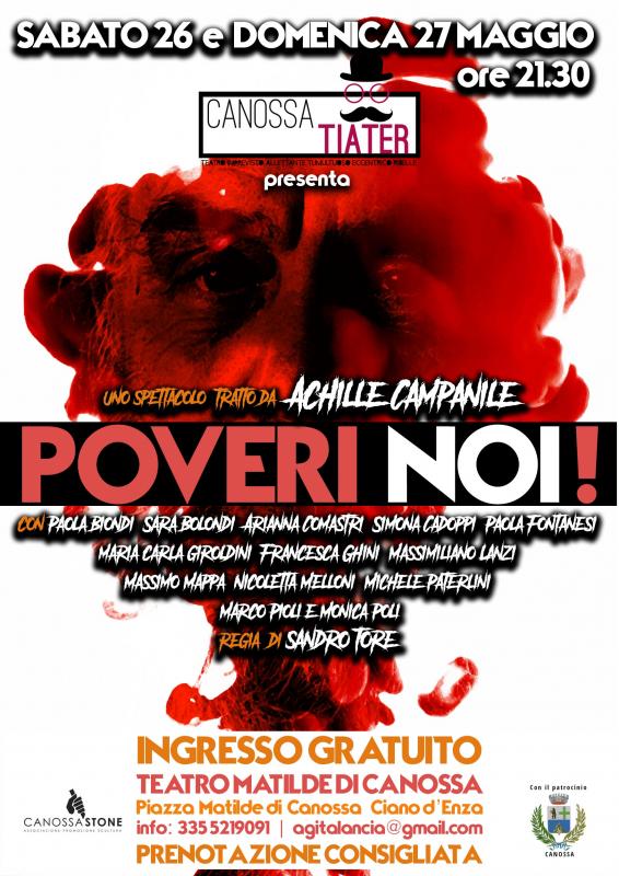 Nell’ambito della ricca proposta culturale nelle terre matildiche, debutta sabato 26 maggio alle ore 21,30, al Teatro Matilde di Canossa, a Ciano d’Enza, “POVERI NOI!”, spettacolo messo in scena dal nuovo gruppo teatrale “CANOSSA T.I.A.T.E.R.” (Teatro Imprevisto, Allettante, Tumultuoso, Eccentrico, Ribelle), con il patrocinio del Comune di Canossa e il sostegno dell’associazione “Canossa Stone”.