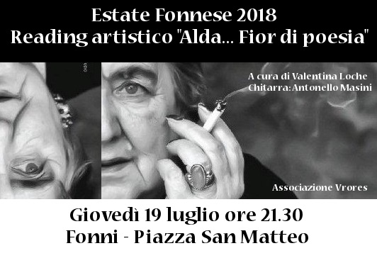L’appuntamento con il reading artistico “Alda… Fior di Poesia” è giovedì 19 luglio 2018 alle ore 21.30 presso P.zza San Matteo a Fonni all’interno della manifestazione “Estate Fonnese 2018” organizzata dal Comune e da tutte le Associazioni. Sarà l’attrice Valentina Loche, con l’accompagnamento musicale di Antonello Masini, a dare voce alla biografia e alle poesie di Alda Merini.