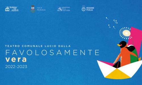 La Stagione "Favolosamente Vera" dedicata alle nuove generazioni è ideata dalla Compagnia Bottega degli Apocrifi, sostenuta da Regione Puglia e Ministero della Cultura, in collaborazione con Comune di Manfredonia in virtù del Partenariato Speciale Pubblico Privato per la valorizzazione del Teatro Comunale Lucio Dalla.