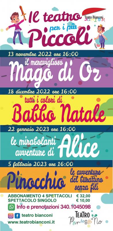 Al Teatro Bianconi dopo l’apertura del cartellone principale e della Stagione di Danza è giunto il momento del debutto della Stagione Junior: quattro appuntamenti dedicati ai ragazzi e ai bambini organizzati con la collaborazione della Compagnia del Teatro Pantegano di Roma specializzata in spettacoli per i più piccoli.