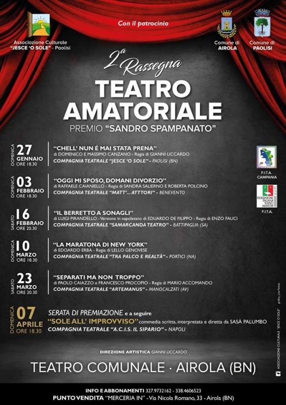 Sei le serate in programma al Teatro Comunale, sotto la direzione artistica di Gianni Liccardo ed organizzate dall’Associazione Culturale Jesce ‘o Sole di Paolisi, che vedranno alternarsi altrettante compagnie teatrali della Campania.