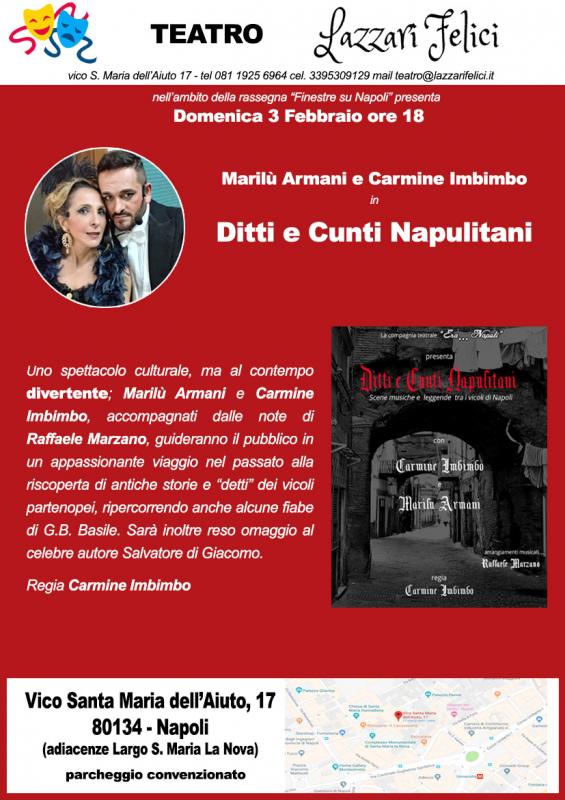 Domenica 3 febbraio 2019 alle ore 18 al teatro Lazzari Felici, nell’ambito della rassegna teatrale, musicale e culturale “Finestre su Napoli, la compagnia teatrale “Era Napoli”, presenta il nuovo spettacolo “Ditti e Cunti Napulitani”: uno spettacolo divertente ma al contempo culturale; Marilù Armani e Carmine Imbimbo, accompagnati dalle note di Raffaele Marzano, guideranno e coinvolgeranno il pubblico in un appassionante viaggio nel passato, alla riscoperta di storie detti e riti scaramantici che caratterizzano i vicoli napoletani sin dai tempi antichi. Saranno omaggiati alcuni celebri autori, da G.B. Basile ad Eduardo sino a Salvatore di Giacomo. Non resta, dunque, che partecipare ed assistere allo spettacolo.