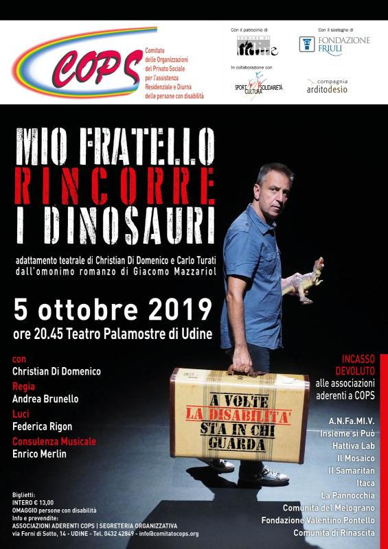 “A volte la disabilità sta negli occhi di chi guarda”, questo il filo conduttore dello spettacolo teatrale benefico “Mio fratello rincorre i dinosauri” promosso dal Comitato delle organizzazioni del Privato Sociale per l’assistenza residenziale e diurna delle persone con disabilità (COPS) in programma il 5 ottobre 2019, alle 20.45, presso il Teatro Palamostre di Udine.