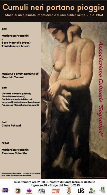 Sabato 14 settembre 2019 alle ore 21.30, nell’ambito della rassegna Borgo del Teatro, collezione estate – autunno organizzata dall’Associazione BlogAL con il contributo di Fondazione SociAL, presso il cortile del Chiostro di Santa Maria di Castello, Piazza Santa Maria di Castello 14, Alessandria, la Compagnia I Sognattori presenta lo spettacolo Cumuli neri portano pioggia.
