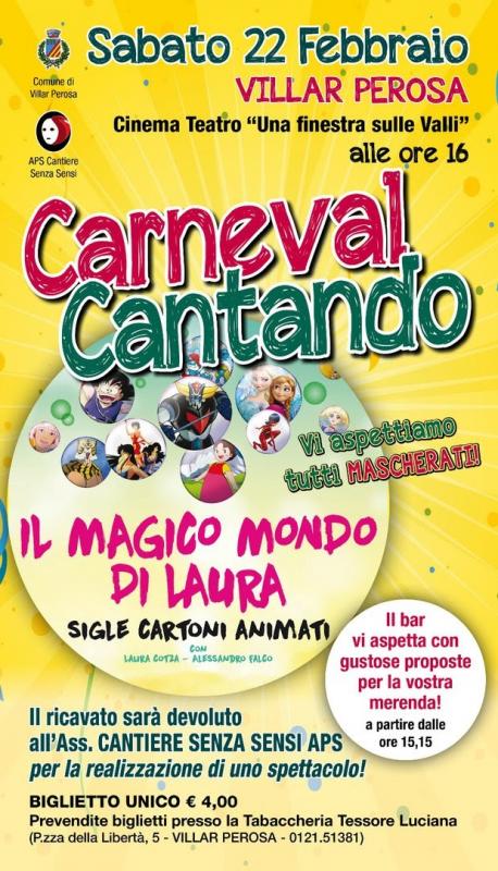 Sabato 22 febbraio si festeggerà il Carnevale al Cinema Teatro “Una Finestra sulle Valli”, in viale S. Pertini a Villar Perosa. “Carneval Cantando” sarà un pomeriggio di festa in maschera con merenda e musica.