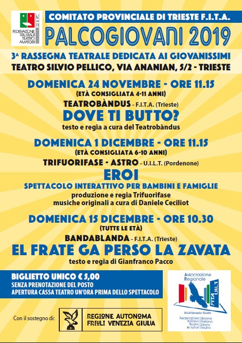 L’iniziativa teatrale rivolta ad un pubblico di giovani e giovanissimi promossa ed organizzata dal Comitato Provinciale di Trieste-Gorizia F.I.T.A. viene riproposta per il terzo anno consecutivo al pubblico del Teatro Silvio Pellico (via Ananian 5/2 – Trieste). Si tratta della 3a Rassegna Teatrale PALCOGIOVANI 2019.