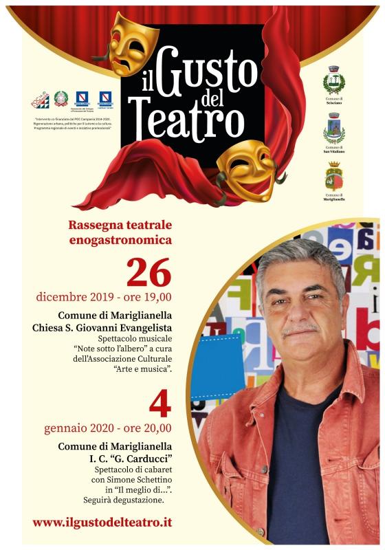 Il 2020 comincia con un nuovo appuntamento della rassegna teatrale “Il Gusto del Teatro”, progetto promossa dal Comune di Scisciano, in partenariato con i comuni di San Vitaliano e Mariglianella ed è co-finanziata dalla Regione Campania nell’ambito del POC Campania 2014/2020 - Linea Strategica 2.4 “Rigenerazione urbana, politiche per il turismo e cultura”. Dopo lo spettacolo musicale “Note sotto l’Albero”, a cura dell’Associazione Culturale “Arte e Musica”, ospitato presso la Chiesa di S. Giovanni Evangelista di Mariglianella, sarà la volta di Simone Schettino, il celebre cabarettista partenopeo, che si esibirà, sempre a Mariglianella, presso la palestra dell’Istituto Comprensivo Giosuè Carducci, sabato 4 gennaio, a partire dalle ore 20,00. Noto ai più come il “Fondamentalista Napoletano”, Simone Schettino allieterà il pubblico con il suo spettacolo teatrale “Il meglio di…”, in cui ripercorrerà alcuni dei sui più importanti successi. Al termine dello spettacolo verrà offerta una piccola degustazione di bontà locali ai partecipanti. Per assistere allo spettacolo, gratuitamente, è necessario richiedere l’invito presso la Casa Comunale di Mariglianella.