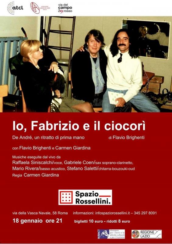 “Io, Fabrizio e il Ciocorì”, spettacolo ispirato a De André nel connubio fra teatro di narrazione e canzone d'autore, arriva a Roma sabato 18 gennaio allo Spazio Rossellini di via della Vasca Navale. Sul palco, insieme all'autore Flavio Brighenti, che cura la narrazione con la regista Carmen Giardina, interagisce una formazione musicale che comprende Stefano Saletti (corde), Gabriele Coen (fiati), Mario Rivera (basso) e Raffaela Siniscalchi (voce).