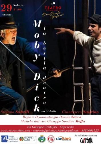 Achab, nella balena bianca, vede i limiti dell’uomo e si getta in un iperbolico inseguimento, con l’unica fiocina per lui possibile: la forza della ragione, del sapere, dell’Arte. Ad accompagnarlo, in questi mari, Ismaele, giovane, forte, bello, ancora inesperto forse ma non ingenuo e piuttosto, in tutto, simile ad Achab nella tenacia e nella sfrontatezza di sfidare Natura, Fato, Divino, grazie alla capacità di saper improvvisare, di star sempre sull’onda nel momento di maggior necessità! Così simili da essere, forse, padre e figlio… Oppure, forse, anche diversi ma uniti dalla forza di sfidare ognuno il proprio mostro… dentro il mare del Sé.Con Stefano Sabelli e Gianmarco Saurinotratto da Melvilleadattamento e regia Davide Saccomusiche composte ed eseguite dal vivo Giuseppe S.Moffa