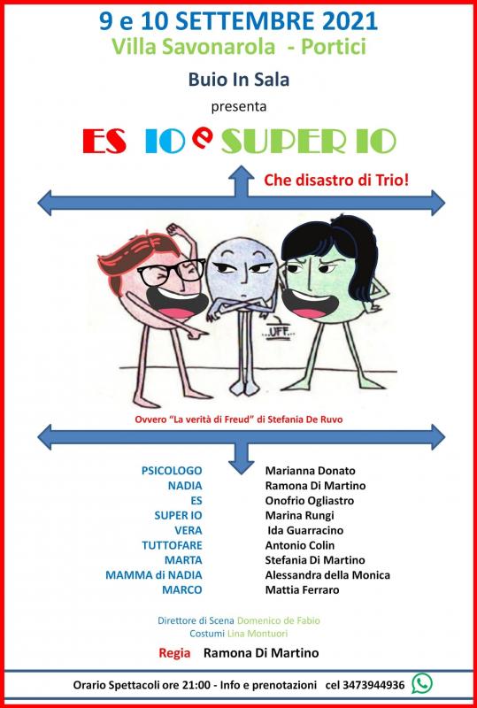 Secondo Freud la nostra personalità è caratterizzata da ES, IO e SUPER IO.Es rappresenta la parte non organizzata di noi stessi ed è connessa a pulsioni internecome fame, sesso e impulsi irrazionali e nella nostra commedia è anche volgare echiassoso.SUPER IO invece rappresenta il concetto di bene/male o giusto/sbagliato tramandato dagenitori, insegnati , modelli di riferimento. Insomma Il super Io è quello che ci fa sentire incolpa quando sappiamo di aver sbagliato e ci scandisce obblighi morali e di condotta. Napesantezza diciamoci la verità!IO poverino ha il compito di mantenere in equilibrio es e Super Io mitigando le loro volontàe mostrandosi al mondo intero.Nadia, la nostra protagonista, purtroppo non riesce a gestire ES e SUPER IO e si ritrovasbandata tra momenti di impulsi irrazionali e turbinii di sensi di colpa generati da obblighimorali verso la famiglia.Tutti i personaggi della commedia avranno fatto vincere una parte della propria personalitàchi ES come Vera (amica di Nadia) e Marco (Fratello di Nadia) e chi il SUPER IO come laMamma e la sorella di Nadia.Riuscirà Nadia a trovare il suo equilibrio? Soprattutto riusciremo a capire quanti fratelli haBaldo? Chi è Baldo? Beh venitelo a scoprire!