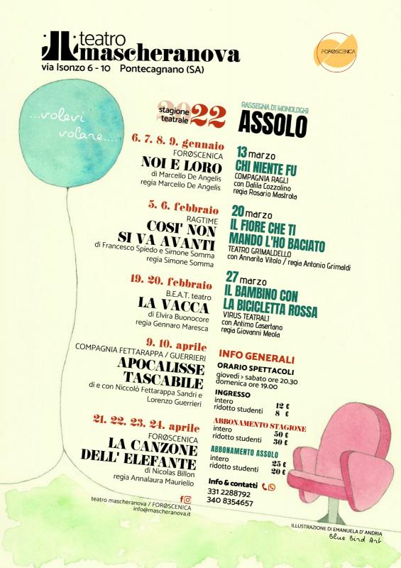 “… volevi volare” è l’invito di Mascheranova e Forøscenica, le due Associazioni che gestiscono lo spazio, per una proposta teatrale che si rinnova, anche per la stagione 2022, con la volontà di dare una scelta di un teatro differente al pubblico di Pontecagnano con una direzione artistica che punta a ricercare spettacoli di nicchia con un alto valore artistico.