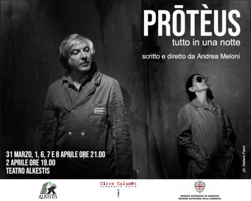 PRŌTÈUS tutto in una notte è nuova produzione originale della storica realtà teatrale cagliaritana Teatro Laboratorio Alkestis CRS in collaborazione con la compagnia d’arte Circo Calumèt, scritto e diretto da Andrea Meloni, con Andrea Meloni e Sabrina Mascia.