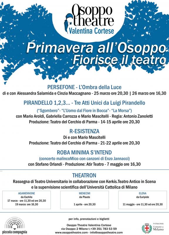 Di certo Milano non sarà un facile terreno di conquista: tante le programmazioni concorrenti, tanta l’offerta artistica e culturale per un pubblico così eterogeneo. Cosa distingue, quindi, l’Osoppo Theatre Valentina Cortese dagli altri teatri meneghini e perché la sua nuova stagione rappresenta, anche simbolicamente, una “piccola primavera”? “Intanto è il primo teatro che vuole rendere omaggio a un’attrice straordinaria, senza pari, quale fu Valentina Cortese” conclude Carrozza “ed è un teatro non commerciale; l’idea nostra è proprio quella di entrare nel sistema teatrale rivalutando il concetto essenziale che la parola a teatro deve essere portata al pubblico secondo tecnica e studio approfondito. Vogliamo cercare di riaccendere l’attenzione di spettatori anche molto giovani, ad esempio con il ciclo di teatro universitario in collaborazione con l’associazione Kerkìs e con l’Università Cattolica, sui grandi autori classici che l’industria teatrale non considera più “attuali”. Proporremo così tragedie e commedie latine e greche, ma anche spettacoli dal linguaggio più contemporaneo con produzioni del Teatro del Cerchio e di ATIR Teatro Ringhiera. Desideriamo allontanarci da quegli spettacoli che prediligono forme e registri volti soltanto ad impressionare il pubblico, e che sembrano quasi rispondere a una nuova omologazione del linguaggio teatrale. Il teatro ha bisogno di esprimere ancora tanto, senza artifici, senza effetti speciali, parlando attraverso la forza della poesia, rivolgendosi anche al proprio quartiere di appartenenza. Del resto, nel nome che ci siamo scelti c’è tutto questo: il nostro omaggio alla tradizione teatrale più bella e il nostro respiro nuovo che si affaccia su questa grande Milano multietnica”