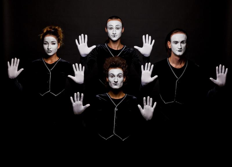 Quattro figure vestite di nero e truccate di bianco con il solo uso del corpo evocano gli scenari più fantasiosi: un allegro circo, una gara olimpica, un misterioso mondo sottomarino e molto altro ancora. Sequenze tratte dalla quotidianità, fatta di tic comici e buffe situazioni, ma anche oniriche storie d’amore tra due statue viventi e poetici ritratti della natura. Un viaggio tra divertimento, poesia e satira sociale, con uno sguardo ironico e delicato.