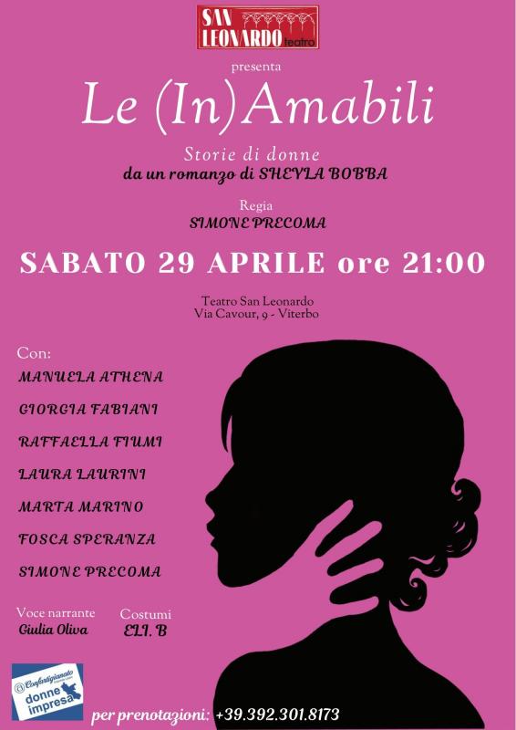 Sabato 29 Aprile 2023 ore 17,00 presentazione del libro Le InAmabili di Sheyla Bobba presso il Bistrot del Teatro seguirà alle ore 21 lo spettacolo “Le (In)Amabili, storie di donne” tratto dal libro di Sheyla Bobba per la regia di Simone Precoma, spettacolo col quale si conclude “Persistenza” la Stagione teatrale del Teatro San Leonardo.
