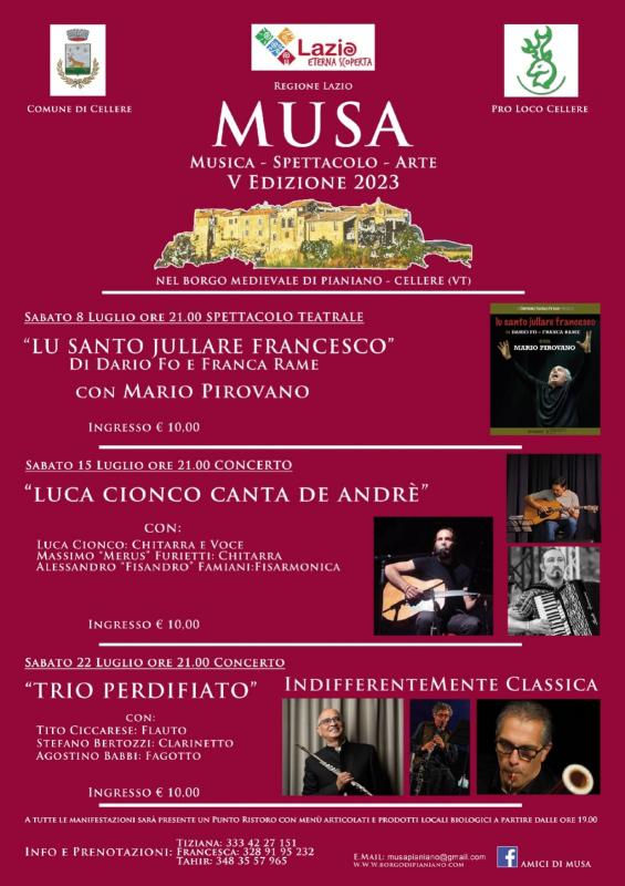 Nel mese di luglio ritorna MUSA Pianiano, con tre serate evento dedicate al teatro e alla musica. Il primo si terrà il giorno 08/07/2023, spettacolo teatrale intitolato Lo Santo Jullare Francesco di Dario Fo e Franca Rame, interpretato dall'artista Mario Pirovano. Il secondo avrà luogo il giorno 15/07/2023, spettacolo musicale dedicato a Fabrizio De Andrè ed interpretato dagli artisti Luca Cionco, Massimo Furietti e Alessandro Famiani. Il terzo ed ultimo appuntamento si terrà il giorno 22/07/2023 e sarà dedicato alla musica classica ed interpretato dagli artisti del Trio Perdifiato, Tito Ciccarese, Stefano Bertozzi e Agostino Babbi. I posti sono limitati pertanto, se interessati, Vi preghiamo di prenotare ai nr 3334227151, 3289195232, 3483557965
