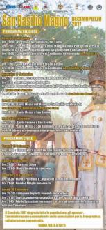 Festeggiamenti in onore di San Basilio Magno a Decimoputzu. PROGRAMMA CIVILE VENERDI 15 SETTEMBRE -Ore 21:00 Gara poetica dialettale con i poeti Cristoforo Muntoni e Saverio Sodde accompagnati dal tenore di Fonni "Gennargentu" SABATO 16 SETTEMBRE -Ore 21:00 I Karisma Show -Ore 23:00 Marco Ligabue in concerto DOMENICA 17 SETTEMBRE -Ore 18:30 Marika Piscedda e...le piccole star di Decimoputzu -Ore 21:45 Amedeo Minghi in concerto LUNEDI 18 SETTEMBRE -Ore 20:30 Estrazione biglietti vincenti della lotteria -Ore 21:15 Spettacolo pirotecnico a San Basilio (ditta Piano Andrea) -Ore 21:45 Adolfo Sebastiani in concerto in lui e gli Amici del Re, tributo ad Adriano Celentano PROGRAMMA RELIGIOSO VENERDI 15 SETTEMBRE -Ore 12:00 Vestizione del simulacro del Santo -Ore 17:00 Partenza del simulacro della Madonna dalla parrocchia di Decimoputzu verso la chiesa di San Basilio accompagnata dai gruppi folk e dai cavalieri -Ore 18:00 Santa messa in onore a San Basilio celebrata da don Paolo Ena SABATO 16 SETTEMBRE -Ore 11:00 Santa messa in onore di San Basilio -Ore 18:30 Santa messain onore di San Basilio celebrata da don GianMarco Casti DOMENICA 17 SETTEMBRE -Ore 7:30 Santa messa (parrocchia N.S delle Grazie) -Ore 9:00 Santa messa a San Basilio -Ore 10:30 Processione e Santa messa del Pellegrino a San Basilio celebrata da padre Luca d'Achille -Ore 18:30 Santa messa a San Basilio celebrata da don Roberto Maccioni LUNEDI 18 SETTEMBRE -Ore 10:30 Santa messa del malato a San Basilio celebrata da sua Eccellenza Monsignor Gianfranco Saba -Ore 18:30 Santa messa a San Basilio MARTEDI 19 SETTEMBRE -Ore 17:30 Santo rosario a San Basilio -Ore 18:00 Santa messa a San Basilio e rientro in parrocchia del simulacro della Madonna accompagnata dai gruppi folk e dai cavalieri