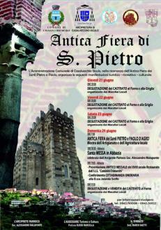 Antica Fiera di S. Pietro Sagra del castrato Dal 21 al 24 giugno 2018 Abbazia S. Pietro Casalvecchio Siculo (ME) Fiera mercato di San Pietro Ogni anno, l'ultima domenica di giugno, si tiene, in contrada Cristuri – sul torrente Agrò, in prossimità dell' abbazia- l'antica fiera di San Pietro. E'un mercato che si svolge sin dai tempi più remoti ed infatti un tempo era uno dei più importanti della Sicilia, durava ben undici giorni e si poteva acquistare di tutto, dagli animali ad ogni altro tipo di mercanzia . Attualmente si è notevolmente ridotta ed è molto rinomata soprattutto per la tradizionale carne d'agnello al forno, che può essere degustata sul posto in luoghi appositamente attrezzati dai rinomati macellai locali.