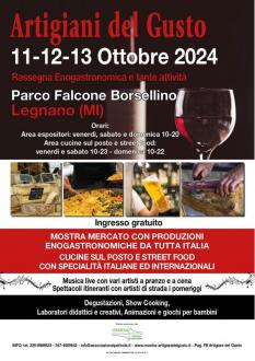 Rassegna Enogastronomica Con Esposizione e Vendita al pubblico con produzioni di diverse Regioni italiane Cucine sul posto e Street Food con piatti e specialità italiane e straniere Degustazioni, laboratori creativi per bambini, area giochi senza limiti di tempo Animazioni e spettacoli con vari artisti Musica dal vivo con diversi artisti con musica italiana ed internazionale Venerdì 11, Sabato 12 e Domenica 13 Ottobre 2024 Parco Falcone Borsellino (ingresso da Largo Tosi) Legnano (MI) Orari apertura evento: Aree di esposizione e vendita: Sabato e Domenica dalle 10.00 alle 20.00 Aree cucine sul posto e street food: Venerdì dalle 10.00 alle 23.00 Sabato dalle 10.00 alle 23.00 Domenica dalle 10.00 alle 22.00 Ingresso al pubblico gratuito Arriva a Legnano la rassegna Artigiani del Gusto, con espositori da diverse Regioni Italiane, Venerdì 11, Sabato 12 e Domenica 13 Ottobre 2024 al Parco Falcone Borsellino nel centro storico cittadino di Legnano.