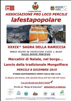 Percile, piccolo borgo dell'Alta Valle dell'Aniene, posto all'interno dell'area protetta regionale del Parco dei Monti Lucretili, ed uno dei Borghi più Belli d'Italia, domenica 08 Dicembre 2019 ospiterà la XXXIX edizione della Sagra della Ramiccia con un ricco menù a base del prelibato piatto di pasta fatta a mano tipicamente Percilese.