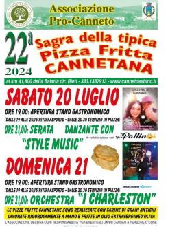 'Associazione Pro Canneto organizza sabato 20 e domenica 21 luglio 2024 la più bella sagra di Canneto Sabino per gustare i sapori della "Tipica Pizza Fritta Cannetana" nella 22° EDIZIONE. Si inizia sabato 20 LUGLIO alle ore 19: Apertura dello stand gastronomico pagamento anche con bancomat. Ore 21: Serata danzante con i "STYLE MUSIC" in collaborazione con Bar Pallino. Domenica 21 LUGLIO alle ore 19: apertura stand gastronomico pagamento anche con bancomat. Ore 21: ORCHESTRA "I CHARLESTON" in collaborazione con Bar Pallino. Vi aspettiamo! Ss.4 Salaria Km. 41.800. Lasciatevi stupire dai nostri sapori. La tipica pizza fritta cannetana è unica, vera inconfondibile!! Venite a Canneto Sabino dove tutto è genuino!!! Il menù: pizza fritta all’olio d’oliva con sale o zucchero, con prosciutto crudo o con nutella, con pomodoro. E poi: patatine fritte, birra alla spina, vino, dolci tradizionali. Le pizze fritte sono fatte con l'olio extravergine di oliva di Canneto Sabino come quelle tradizionali delle nostre nonne.