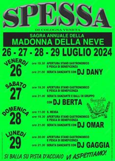 Sagra della Madonna della Neve a Spessa di Cologna Veneta 25/26/27/28 luglio a Spessa di Cologna Veneta “ SAGRA ANNUALE DELLA MADONNA DELLA NEVE “ Organizzata dall’associazione LA CASETTA “ di Spessa .