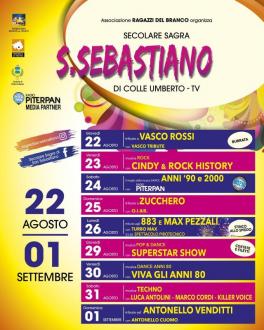 SECOLARE SAGRA DI SAN SEBASTIANO dal 22 agosto al 01 settembre 2024 TUTTI I GIORNI un ricco stand enogastronomico dalle 19.00 , a seguirò spettacoli con i nostri gruppi musicali! _____________ - PRIMA SETTIMANA - * 22 agosto - Giovedì * 19:00 specialità con BURRATA 22:30 VASCO TRIBUTE - tributo Vasco Rossi * 23 agosto - Venerdì * 22:30 Rock con CINDY & ROCK HISTORY * 24 agosto - Sabato * 22:30 Radio PITERPAN con 90210 * 25 agosto - Domenica * 16:00 aperitivo con Dj ANDREA TONON 22:30 O.I.&B. - tributo a Zucchero - SECONDA SETTIMANA - * 26 agosto - Lunedì * 19:00 specialità STINCO ALLO SPIEDO 22:30 TURBO MAX - tributo 883 e Max Pezzali 23:30 * SPETTACOLO PIROTECNICO * * 29 agosto - Giovedì * 19:00 specialità con COSTATA e FILETTI 22:30 Pop and dance con SUPER STAR SHOW * 30 agosto - Venerdì * 22:30 Dance anni 80 con VIVA GLI ANNI 80 * 31 agosto - Sabato * 22:30 TECHNO CLASSIC con LUCA ANTOLINI, MARCO CORDI e KILLER VOICE * 01 settembre - Domenica * 22:30 ANTONELLO CUOMO tributo ad ANTONELLO VENDITTI