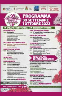 Domenica 5 ottobre – La tradizione protagonista Dalla mattina sport, natura e cultura: memorial di pesca, corsa podistica, lezioni sportive, passeggiata botanica, visite guidate e mostre. Il pomeriggio vedrà l’attesissima sfilata dei carri allegorici, uno dei momenti più identitari e sentiti del Vendemmiale, accompagnati da bande, majorettes, gruppi, musica, e dai quali verranno offerti come da tradizone, uva e vino! Nel pomeriggio, impossibile perdere il tradizionale rito della degustazione del vino dalla Bocca del Leone Capenate. La serata culminerà con il saluto ai carri e il grande concerto degli Area765. Ci vediamo in piazza!