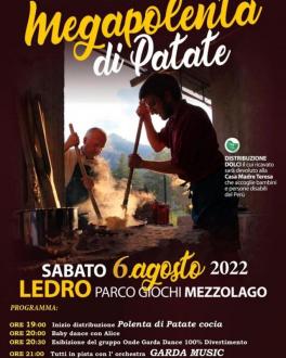 Torna la "Megapolentata di Patate a Mezzolago di Ledro (TN) giunta ormai alla sua 26° edizione. - ORE 19:00 al Parco Giochi di Mezzolago Inizio distribuzione polenta agli affamati e curiosi di assaggiare questo piatto a 5 stelle (piatto tipico Ledrense, un mix unico di patate, formaggio e salamella). - ORE 20:00 Baby dance con Alice - ORE 20:30 Esibizione del gruppo Onde Garda Dance 100% Divertimento. - ORE 21:00 Tutti in pista a ballare con l'Orchestra Garda Music.