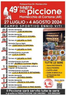 Giunta alla sua 50esima edizione a Montecchio, piccola frazione di Cortona, si svolge la tradizionale Sagra del Piccione, cotto al girarrosto sulla brace, dal 25 luglio al 3 agosto. Il piccione sarà servito tutte le sere, è consigliata la prenotazione. (3282460960 / 3298952260)