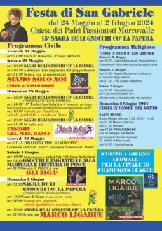 Presso il Piazzale Padri Passionisti di Morrovalle in provincia di Macerata si svolge nei giorni dal 24, 25, 26- 30 Maggio e 1-2 Giugno 2024 la Festa di San Gabriele e l'edizione della Sagra degli Gnocchi con la Papera.