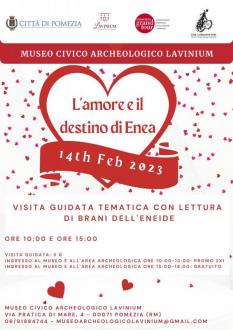 Sarà possibile partecipare, infatti, alla visita tematica al Museo e all'Area Archeologica,”L’amore e il destino di Enea”, accompagnata dalla lettura di alcuni brani scelti dell’Eneide, che ci aiuteranno a scoprire il ruolo determinante assunto dall’amore, in tutte le sue declinazioni e sfaccettature, nella vita dell’eroe fondatore di Lavinium.