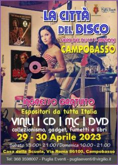 Presso la Casa della Scuola in Via Roma 86100 a Campobasso si svolge nei giorni 29 e 30 Aprile 2023 la 1a edizione della Fiera del Disco "La Città del Disco".